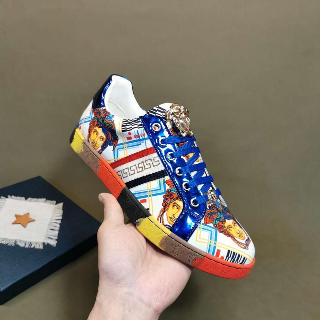 Update your closet with Designer Versace men sneaker the Greca low top sneakers with printed Logo, lace up closure is a High quality sneaker, that will meet your every day fashion style, designed to last. Crafted from leather.