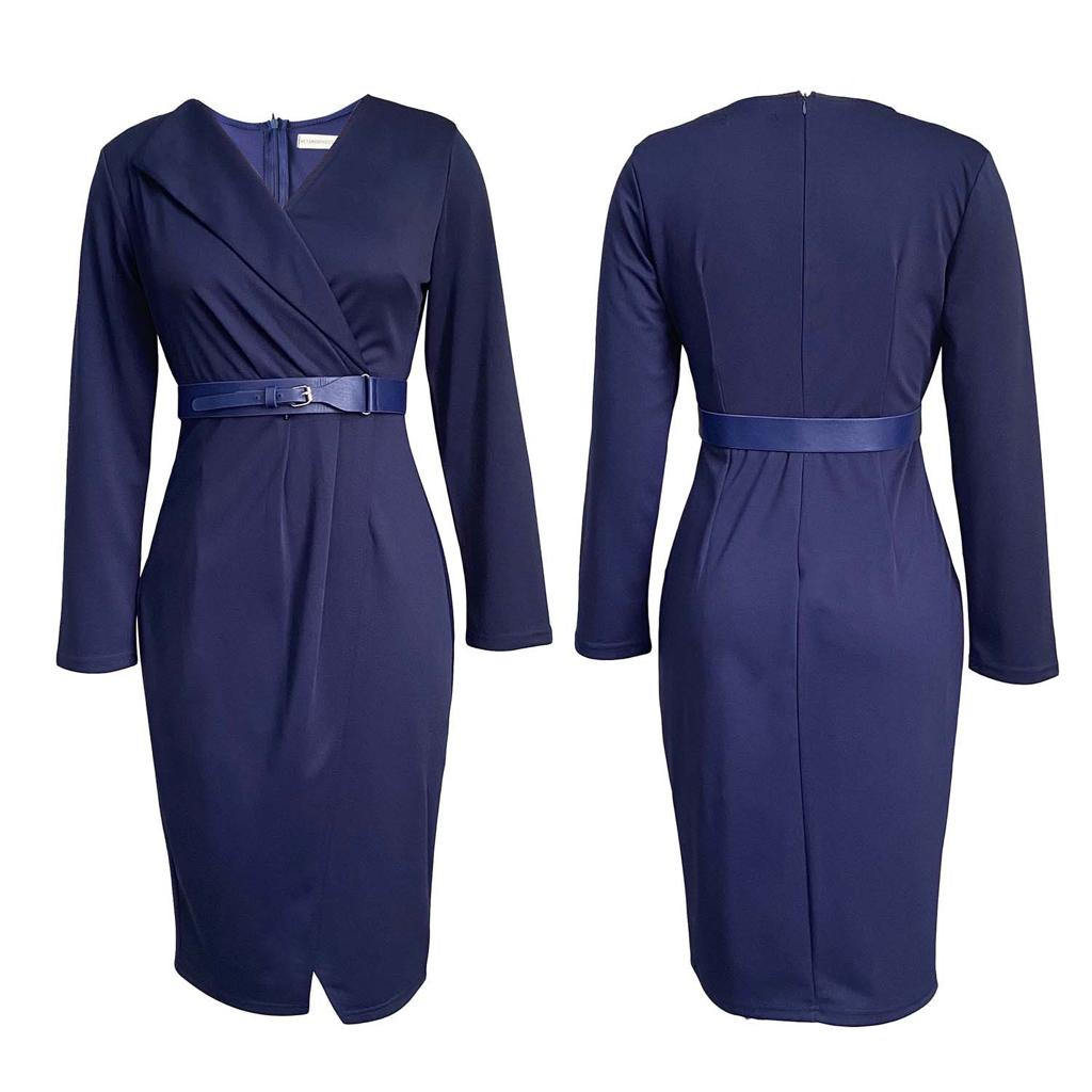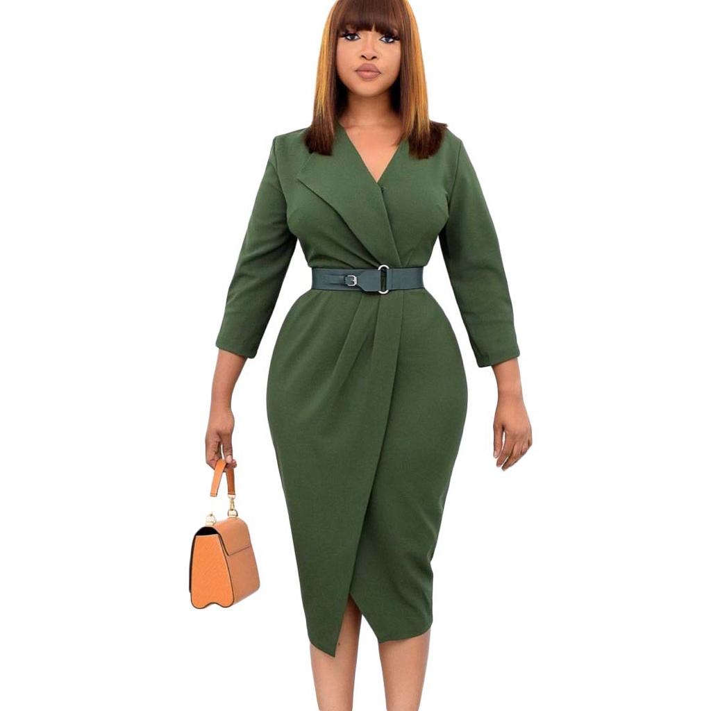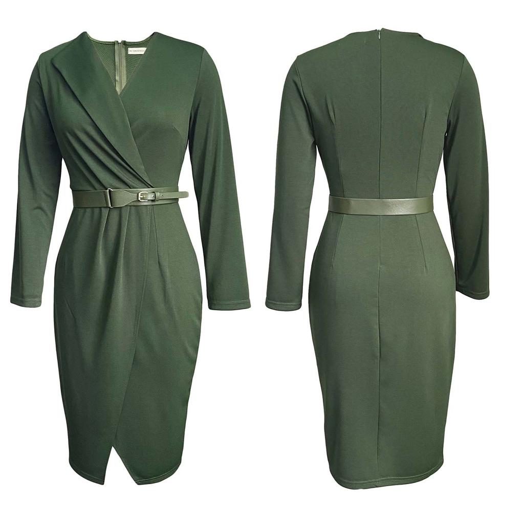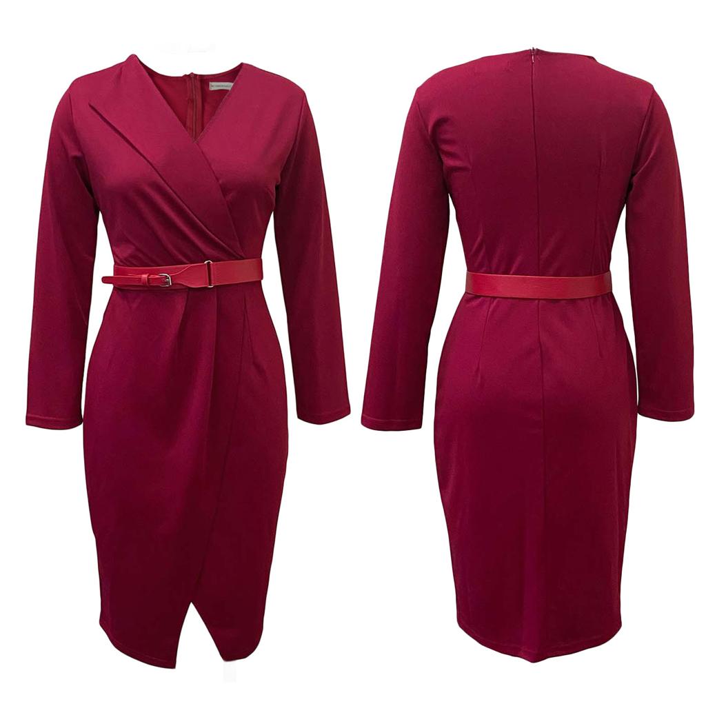 Long-sleeved Solid Color Wrap Dress With Belt