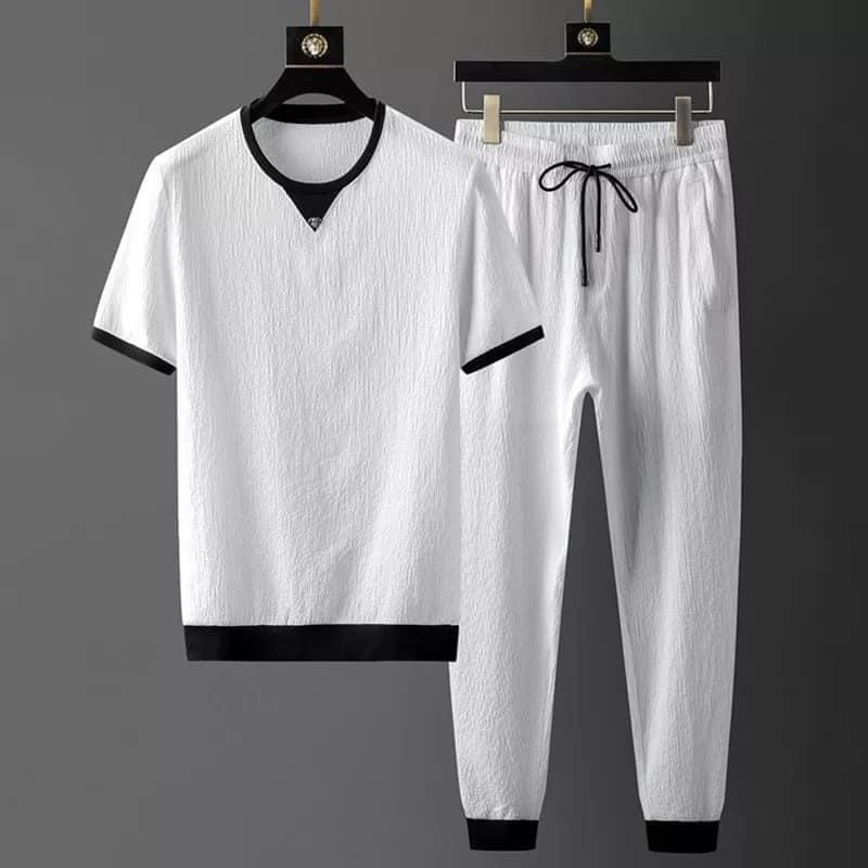 It is a white plain t-shirt and joggers. Very fashionable and it is available in different sizes. It is easy to wash and wear and also very durable. It is made from a fine quality cotton.