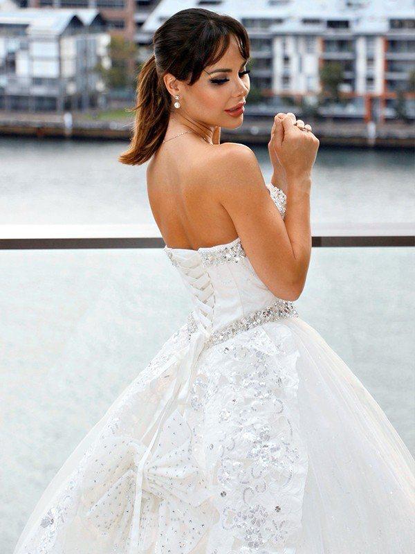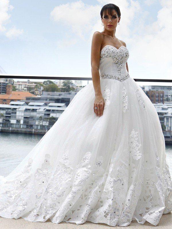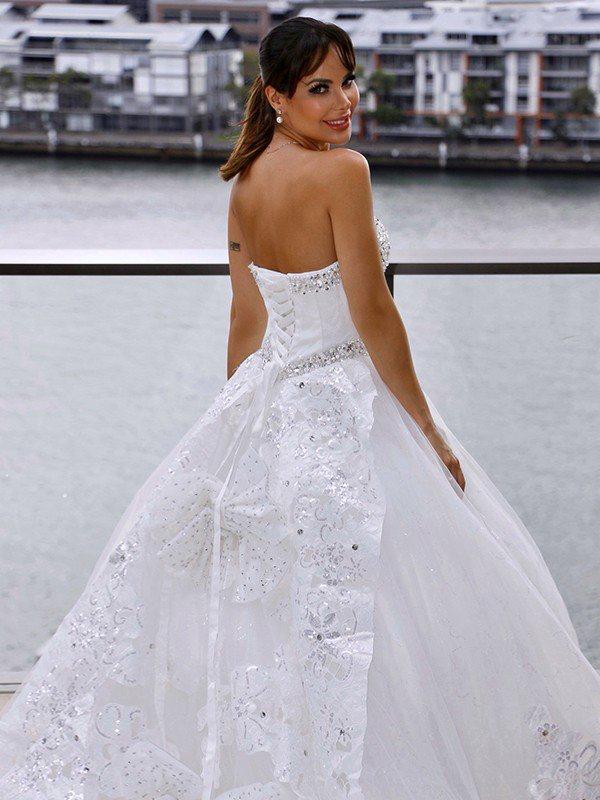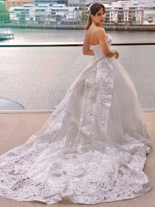 This wedding dress is the perfect tulle gown, accented with embroidered lace appliques and sequins. It completes the whole look.
