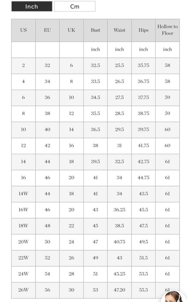 Model size: Height: 5.5 ft, Bust: 33.0 in, Waist: 23.6 in, Hips: 34.6 in, Hollow to floor:55.9 in