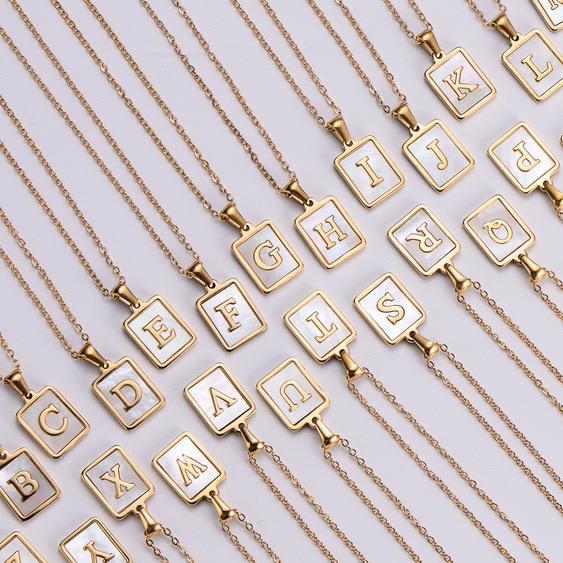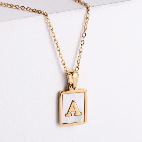 Gold Stainless Steel Square Brand White Shell Letters Necklace